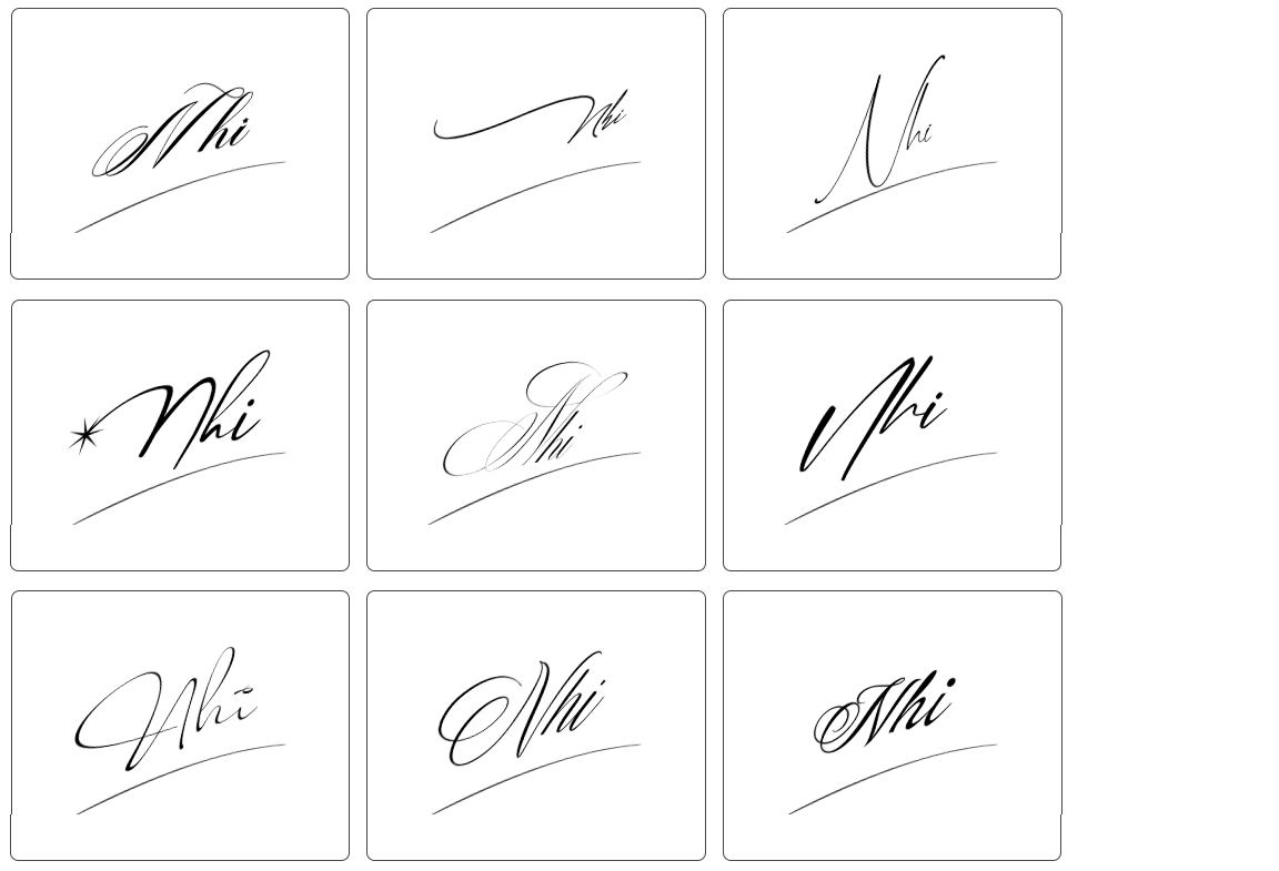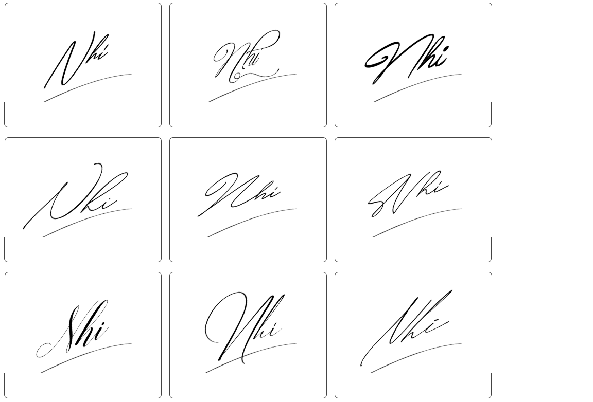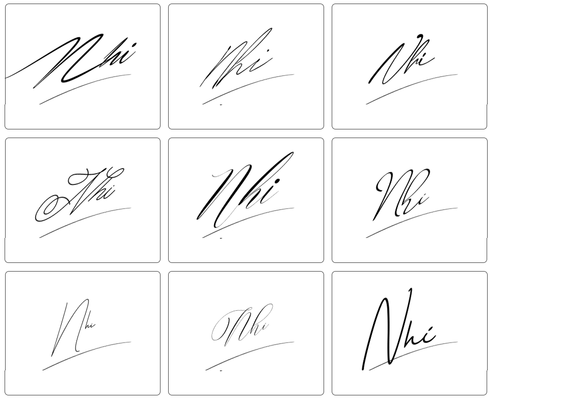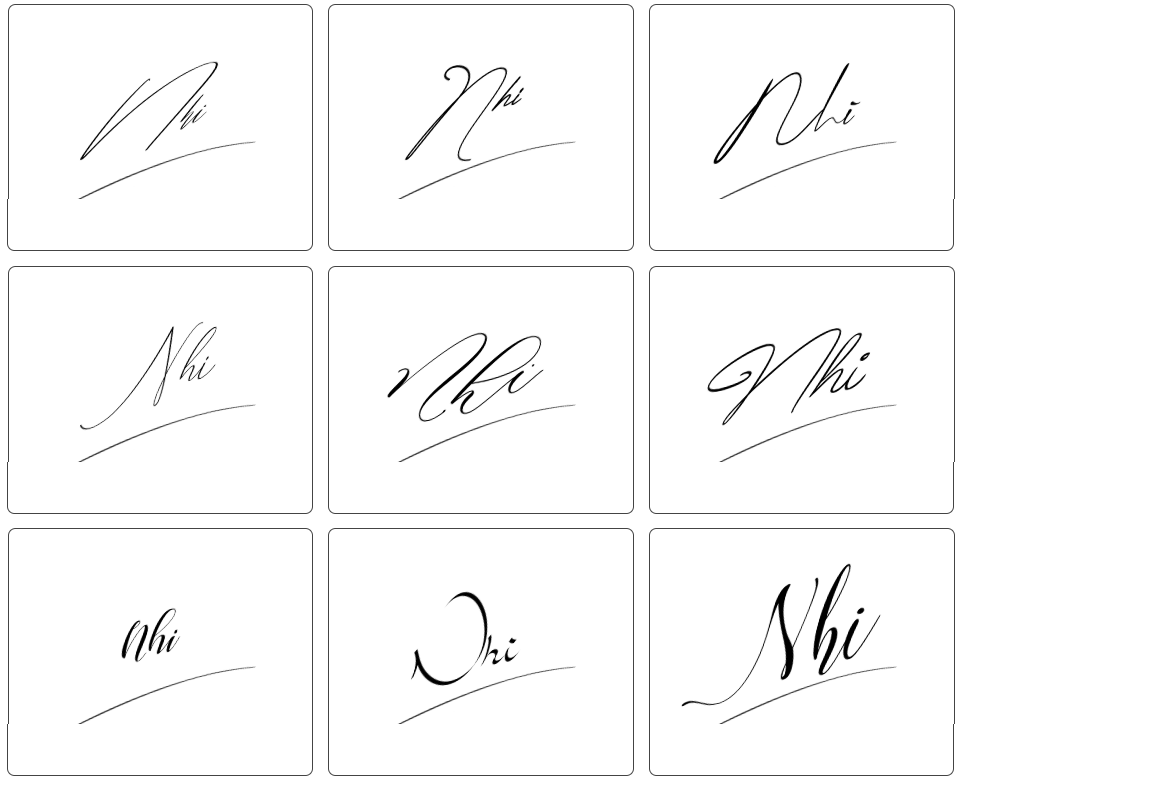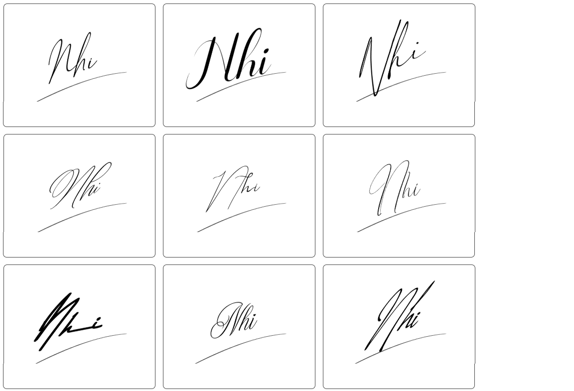 Bạn có thể lựa chọn mẫu chữ ký Nhi phù hợp với tính cách bản thân: từ nét thanh mảnh, bay bổng đến hình khối dứt khoát, mạnh mẽ. Một chữ ký thể hiện đúng con người bạn sẽ dễ dàng tạo thiện cảm với người đối diện, đồng thời tăng thêm sự tự tin trong mỗi lần ký tên.
